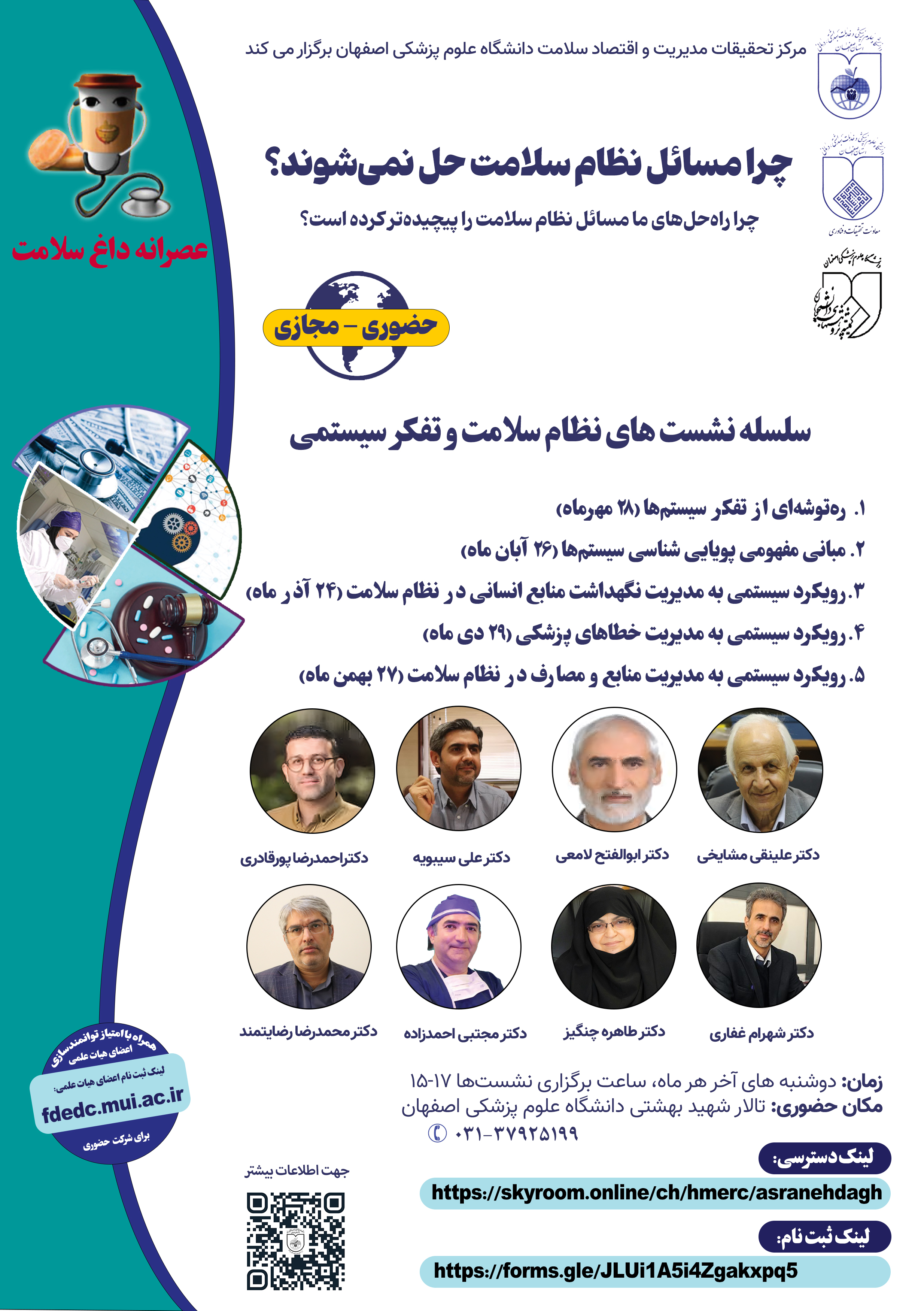 مرکز تحقیقات مدیریت واقتصاد سلامت در راستای رسالت خود برای گفتمان سازی در مورد کلان مسائل نظام سلامت، جلسات «عصرانه داغ سلامت » را با حضور صاحبنظران هر حوزه برگزار می نموده است. اینک «چهلمین نشست عصرانه داغ سلامت» هم زمان با «گردهمایی اساتید اقتصاد سلامت» با موضوع «بررسی بروندادهای آموزشی پژوهشی رشته اقتصاد سلامت» به صورت ویژه برنامه در روز دوشنبه 30 بهمن ماه 1402 از ساعت 8 تا 12 در تالار شهید دکتر بهشتی از مجموعه آموزشی رفاهی غدیر دانشگاه علوم پزشکی اصفهان برگزار می کند.