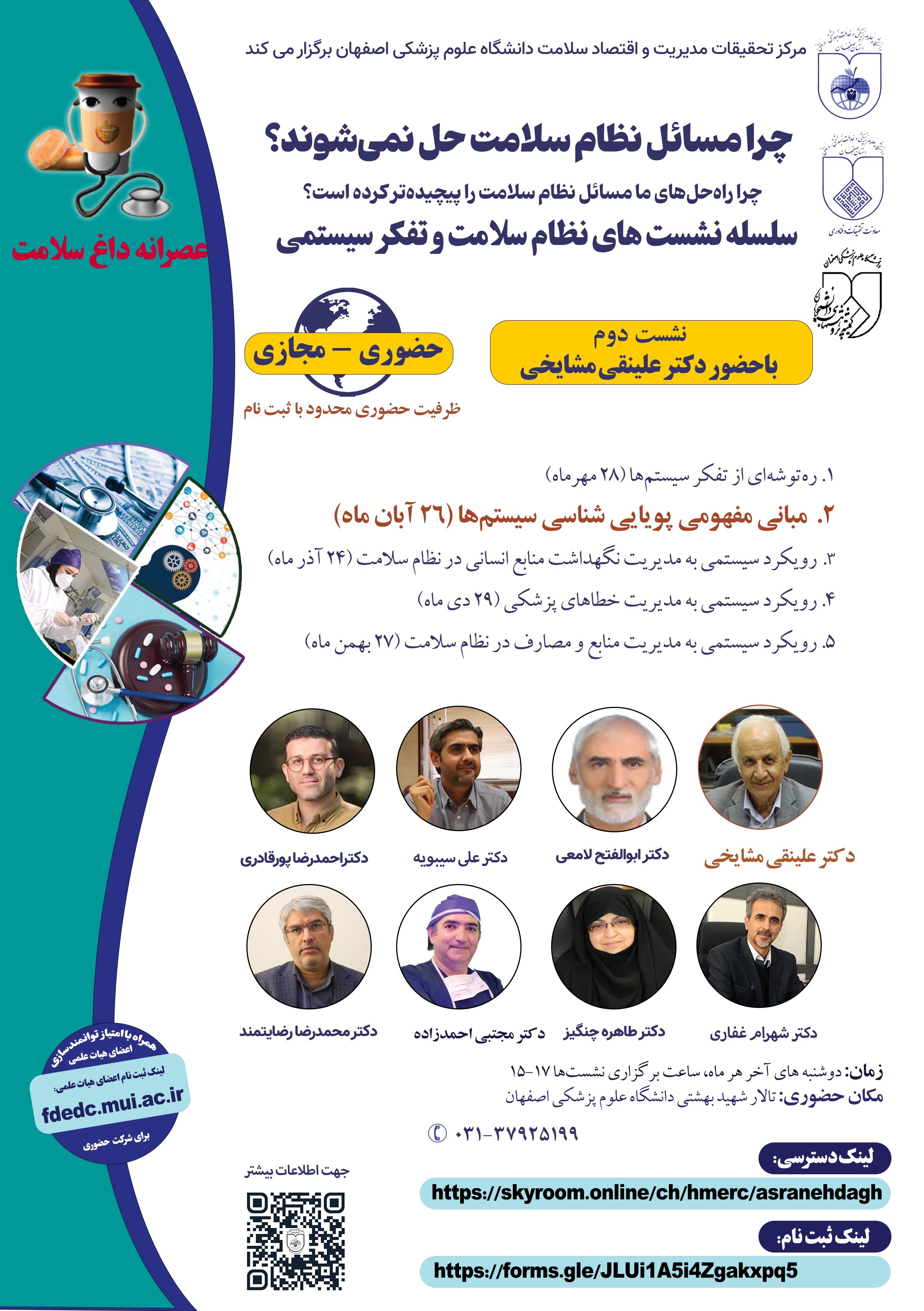 مرکز تحقیقات مدیریت و اقتصاد سلامت و دانشکده مدیریت و اطلاع رسانی پزشکی دانشگاه علوم پزشکی اصفهان، با احساس مسئولیتی عمیق نسبت به آینده نظام سلامت، اقدام به برنامه ریزی«سلسله نشستهای عصرانه داغ سلامت" به صورت حضوری ماهانه و با دسترسی مجازی (آنلاین) با محوریت «تفکر سیستمی برای رهبران» نموده است. اینک در آستانه برگزاری چهل و پنجمین جلسه در تاریخ دوشنبه 26 آبان ماه از ساعت 15 تا 17 در تالار شهید بهشتی(رویش) مجموعه بوستان غدیر دانشگاه با عنوان« مبانی مفهومی پویایی شناسی سیستم ها» با ارایه آقای دکتر علینقی مشایخی، از جامعه فرهیخته اساتید، دانشجویان و مدیران دعوت می شود تا با حضور و مشارکت خود گامی بزرگ در جهت همافزایی علمی برای تقویت نظام سلامت پایدارتر و کارآمدتر بردارند.